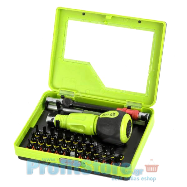 Ένα πλήρες σετ με 34 τεμάχια, 31 μύτες, κατσαβίδι με καστάνια, σταθερή και εύκαμπτη προέκταση, σε πολυτελή κασετίνα.