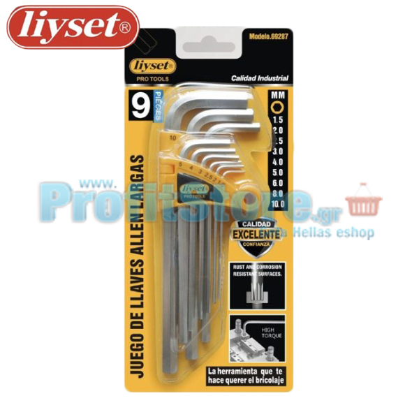 • 9 κλειδιά Άλλεν από ατσάλι Chrome vanadium (CR-V) με γυαλιστερό φινίρισμα πάχους: 1.5, 2, 2.5, 3, 4, 5, 6, 8, 10mm