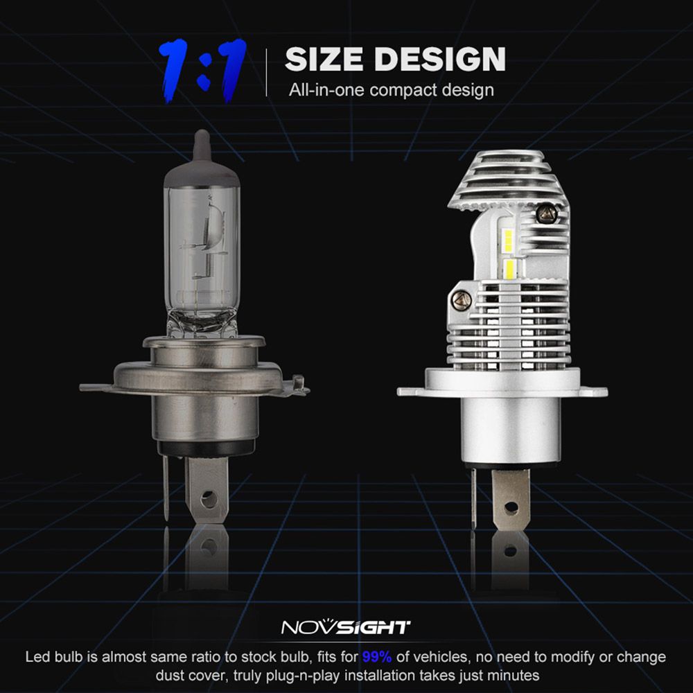 Ζεύγος λάμπες LED τύπου H4 αυτοκινήτου N36 της εταιρείας NovSight®. Χωρίς περιττά μέρη, ballast και καλώδια, απλά συνδέστε στην επαφή H4 και είστε έτοιμοι.
