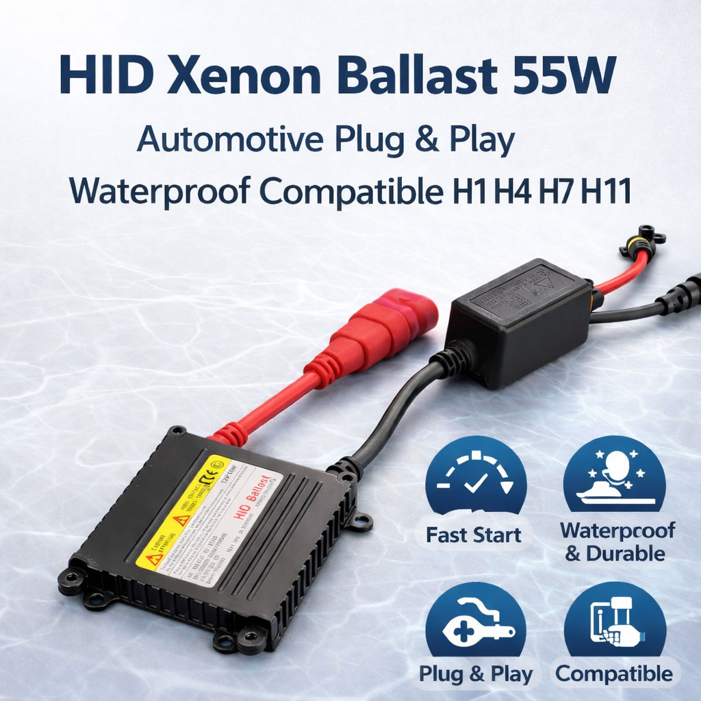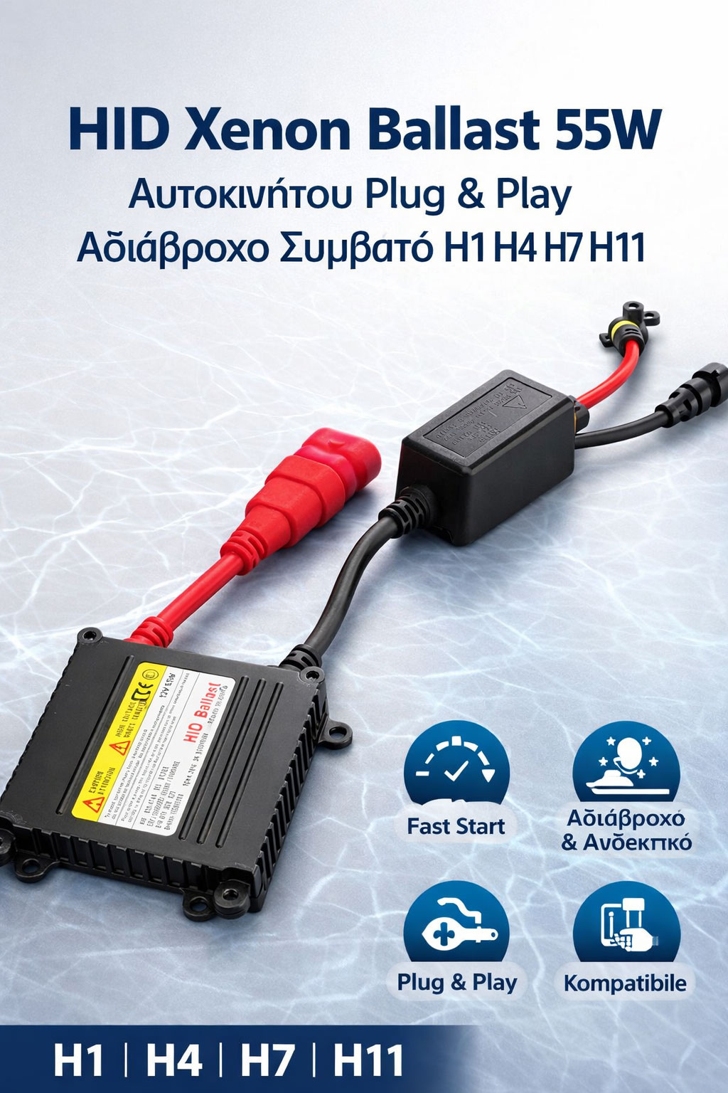 Ηλεκτρονικό HID Ballast 55W για λάμπες xenon, σχεδιασμένο για σταθερή και αποδοτική λειτουργία του φωτισμού αυτοκινήτου.