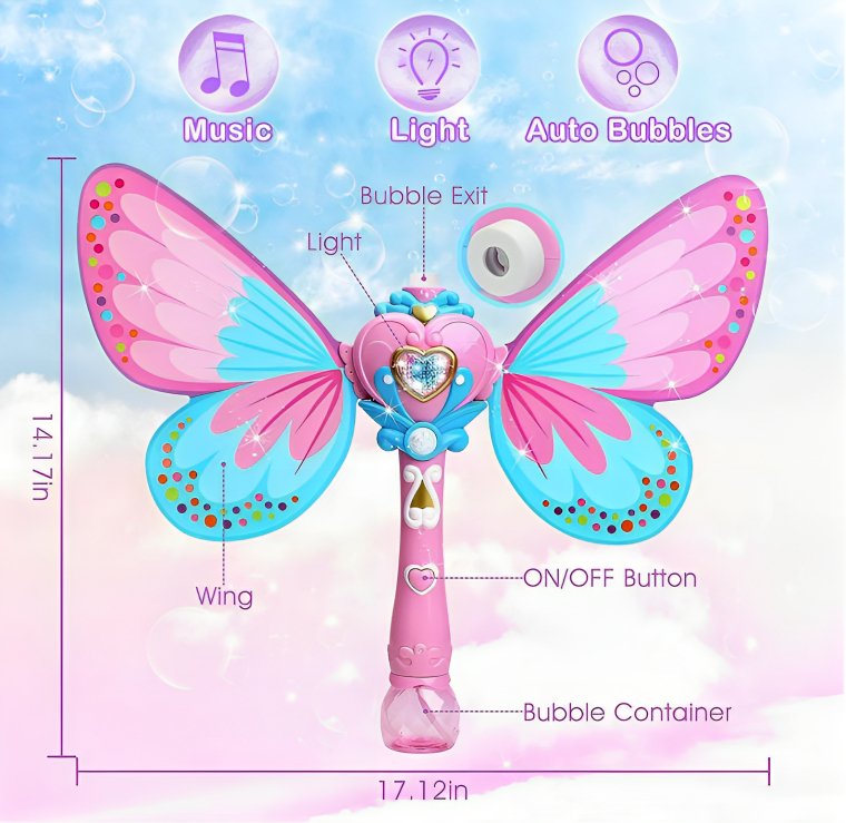 Καθώς κουνάτε το Μαγικό Ραβδί Πεταλούδα, αυτό όχι μόνο δημιουργεί μαγευτικές φυσαλίδες αλλά προσφέρει γλυκές μελωδίες. Η ενσωματωμένη μουσική λειτουργία προσθέτει ένα επιπλέον επίπεδο απόλαυσης στο παιχνίδι σας, καθιστώντας το μια πραγματική εμπειρία!!