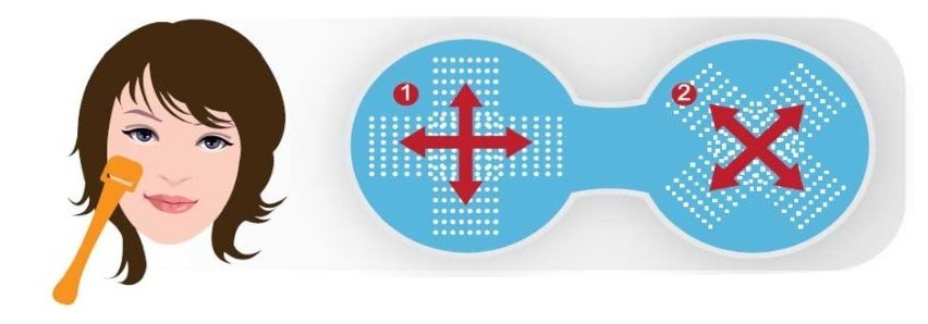 Καθαρίστε καλά και στεγνώστε την περιοχή του δέρματος στην οποία θα εφαρμόσετε την θεραπεία. Μην εξασκείτε μεγάλη πίεση στην συσκευή. Με απαλές κινήσεις και μικρή πίεση κυλήστε την συσκευή οριζόντια, κάθετα και διαγώνια όπως στο σχήμα. Για ευαίσθητες περιοχές όπως το πρόσωπο 10 κινήσεις σε κάθε κατεύθυνση είναι αρκετές. Σε άλλες περιοχές του σώματος η θεραπεία μπορεί να διαρκέσει έως και 5 λεπτά.