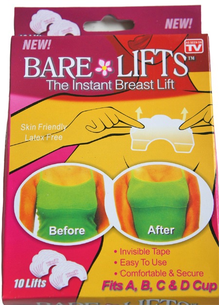 Τα αυτοκόλλητα “Bare Lifts” είναι διαφανή και προσαρμόζονται στην κορυφή του στήθους, όχι κάτω απ’ αυτό, ανασηκώνοντας το χαλαρωμένο δέρμα και επανατοποθετώντας την θηλή σε ένα υψηλότερο σημείο, για μια περισσότερο φυσική, νεανική εμφάνιση.