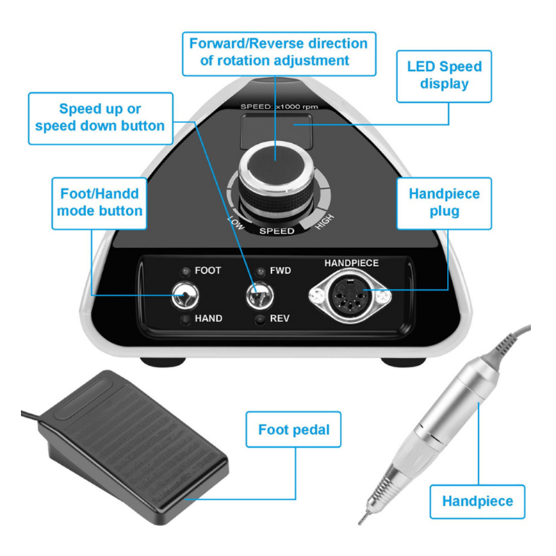 Κάντε ποιοτικό μανικιούρ και πεντικιούρ στο σπίτι εύκολα με την ρυθμιζόμενη ταχύτητα και περιστροφή. Περιστρέψτε το κουμπί ταχύτητας για να την ρυθμίσετε. Πατήστε το διακόπτη "FWD / REV" για να ρυθμίσετε την φορά περιστροφής. Απλή και αποτελεσματική χρήση για τέλεια νύχια κάθε φορα!