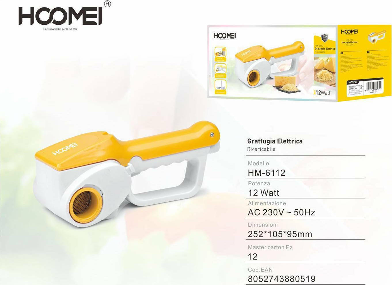 Επαναφορτιζόμενος τρίφτης τυριού χειρός Hoomei® ισχύος 12W. Διαθέτει αυτονομία 45 λεπτά, 2 τύπους εναλλάξιμων κυλίνδρων από ανοξείδωτο χάλυβα και εργονομική λαβή.Ειδικές σχάρες για να τρίβει σκληρό τυρί, ενώ είναι επίσης κατάλληλο για σοκολάτα και για αποξηραμένο ψωμί.