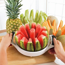 Κόψτε το φρούτο στις άκρες, τοποθετήστε πάνω τον κόφτη Melon Slicer και πιέστε. Οι φέτες είναι έτοιμες να τις σερβίρετε σε χρόνο ρεκόρ.