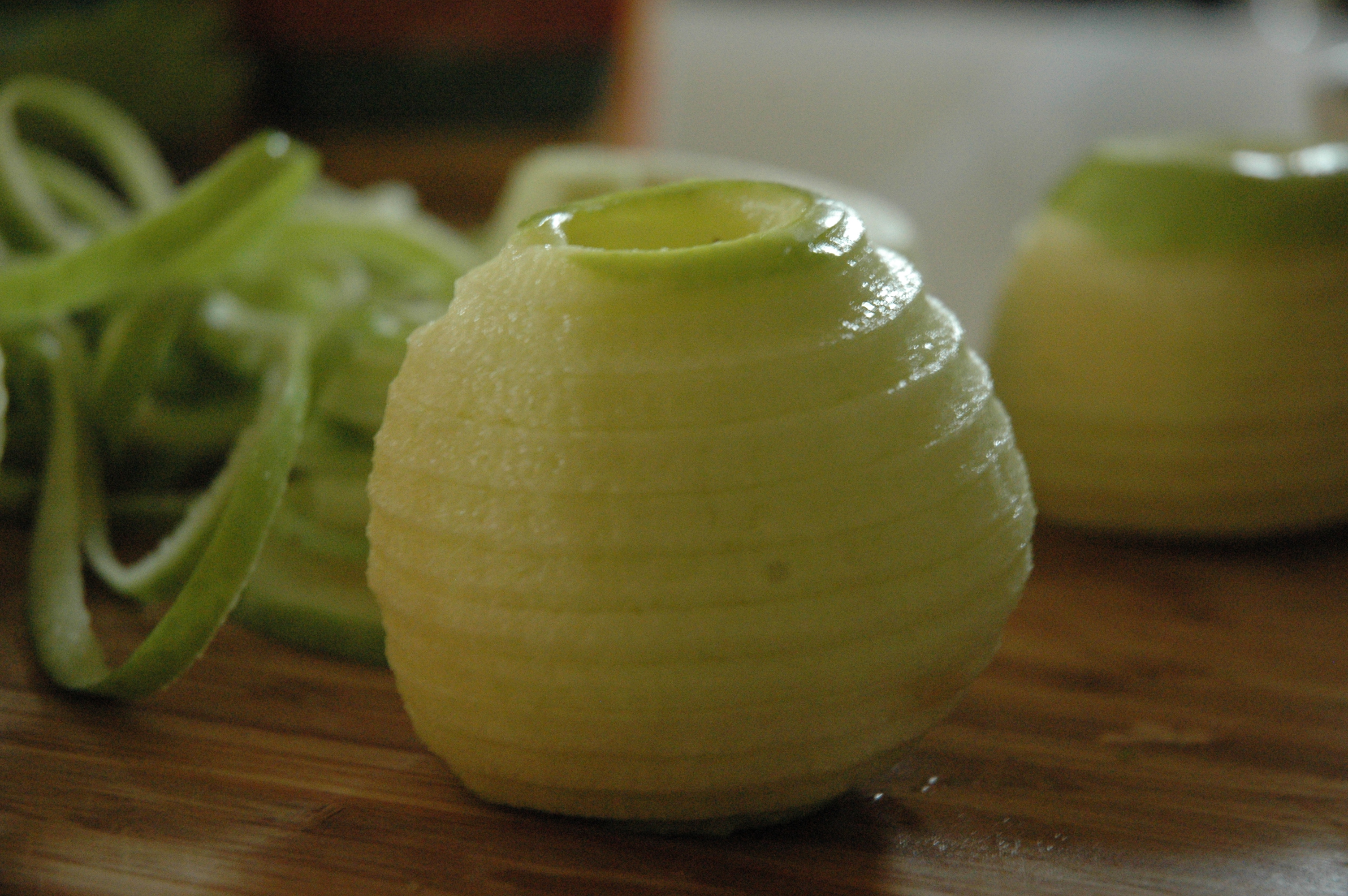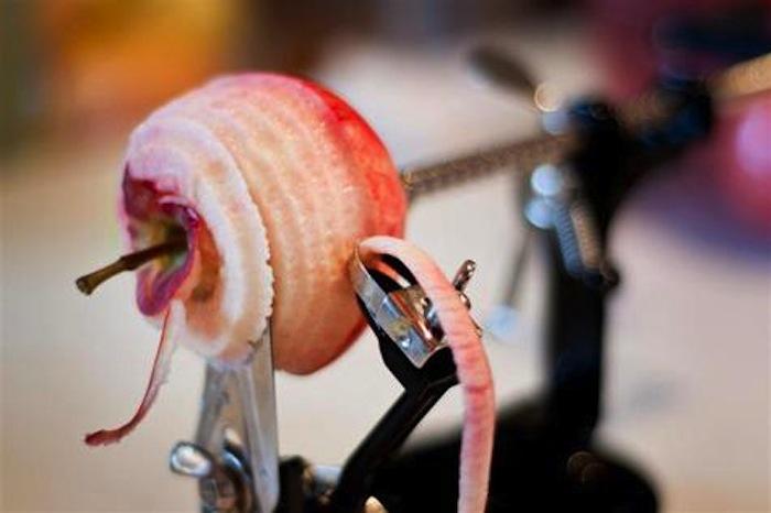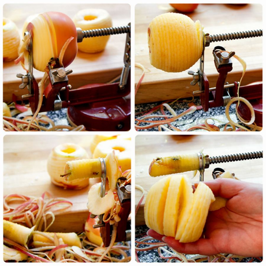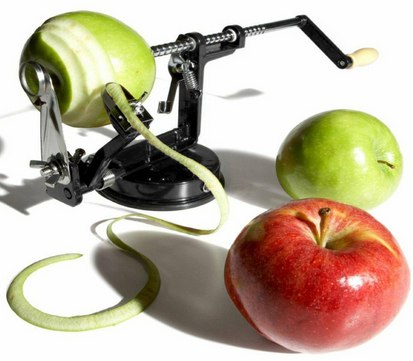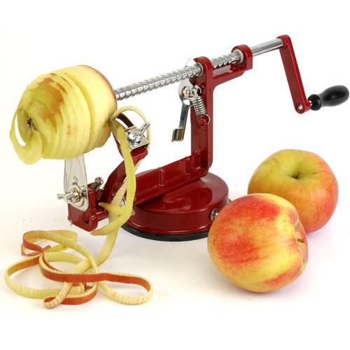 Μεταλλικός Αποφλοιωτής Μήλου 3 σε 1. Καθαρίζει και κόβει τα μήλα σε σπιράλ, για να εκτελείτε με ευκολία όλες τις αγαπημένες σας συνταγές. Μπορεί επίσης να αφαιρέσει το κεντρικό κομμάτι με τους καρπούς και τα κουκούτσια αφήνωντας μόνο το ''ψαχνό" του φρούτου. Δείτε παρακάτω το βίντεο.