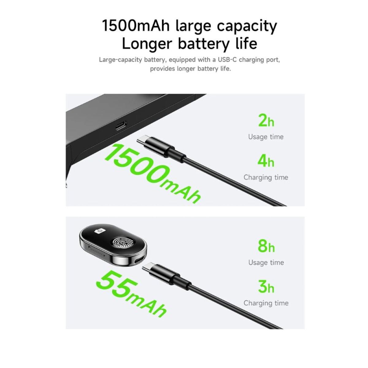 Βαθμιαία χρήση μπαταρίας - ενσωματωμένη μπαταρία στο holder 1500 mAh με χρόνο χρήσης περίπου 2 ώρες και φορτίζει με Type‑C· τηλεχειριστήριο 55 mAh με περίπου 8 ώρες λειτουργίας
