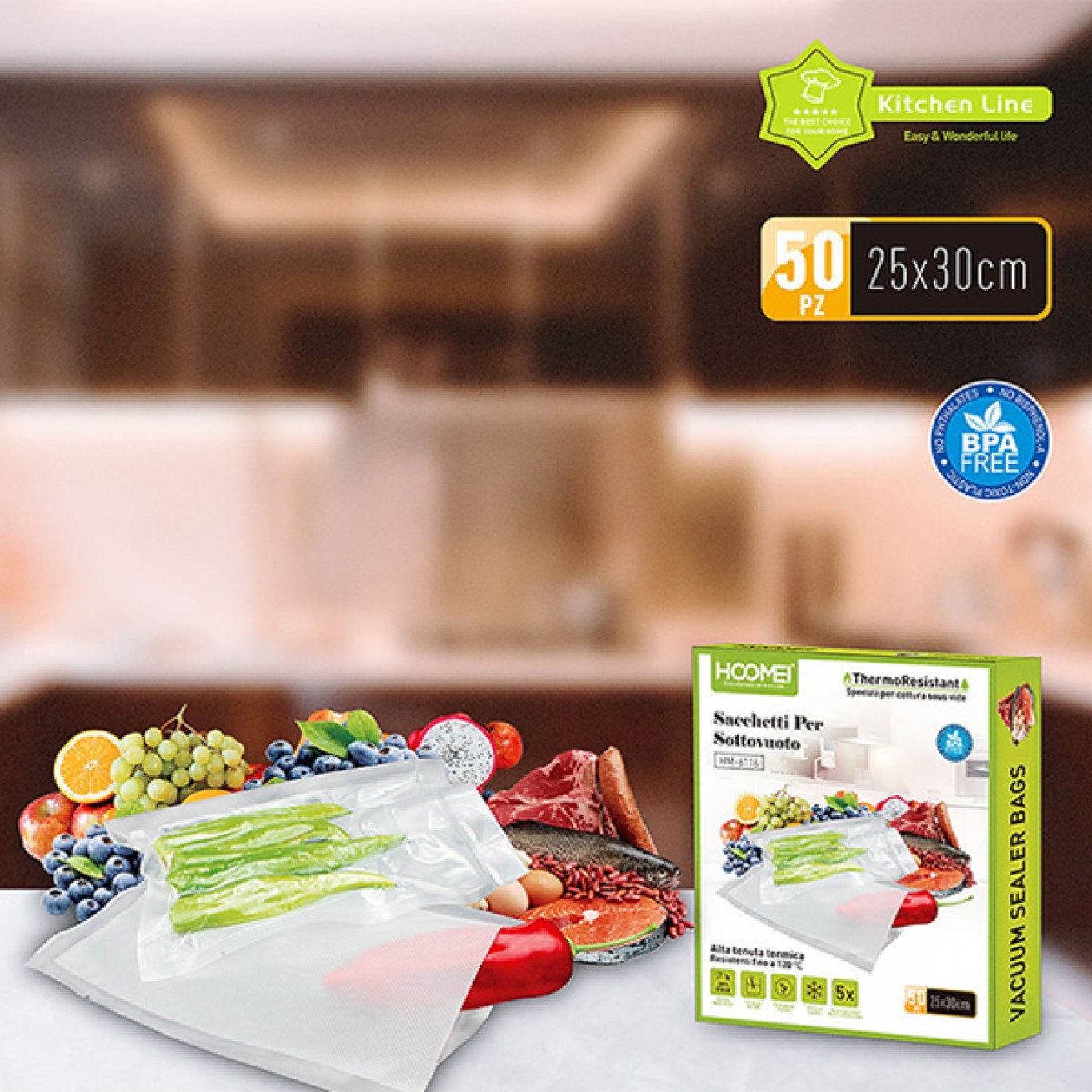 50 Σακούλες για αεροστεγές σφράγισμα τρομίμων της Hoomei®, για να διατηρήσετε τα τρόφιμα σας φρέσκα και αναλλοίωτα έως και 5 φορές περισσότερο. Με υψηλή αντοχή στη θερμότητα έως 120C, επαναχρησιμοποιήσιμες, μπορούν να θερμανθούν και να πλυθούν στο πλυντήριο πιάτων και λειτουργούν σε όλες τις μηχανές κενού.