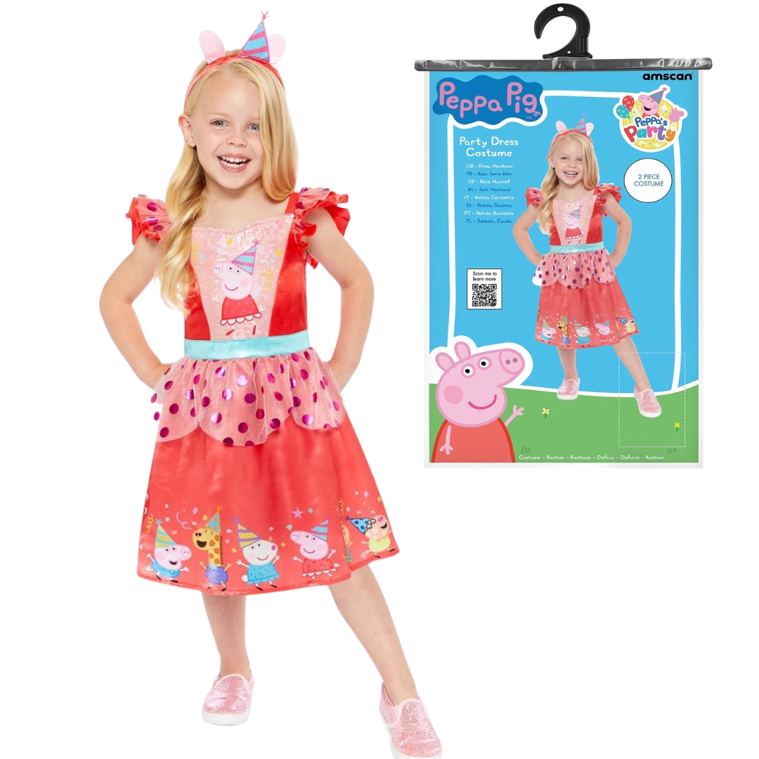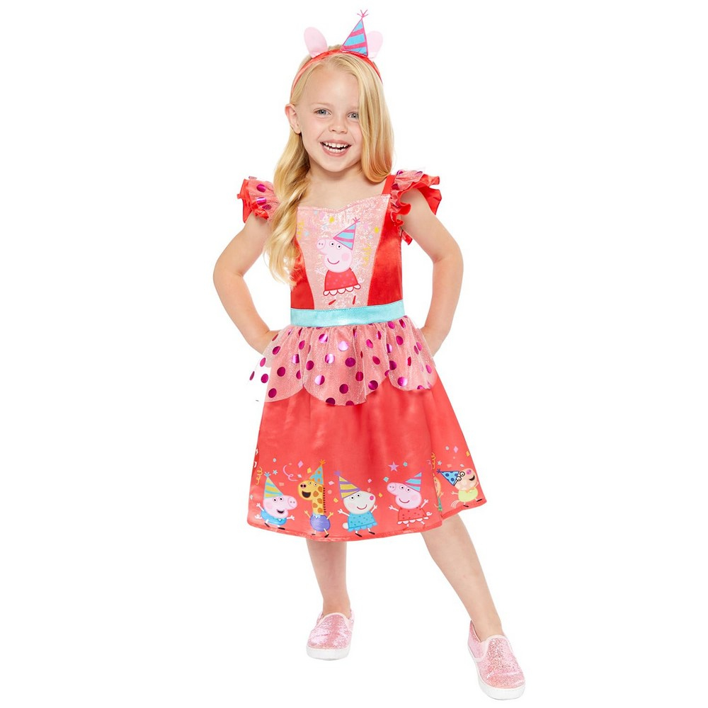 Η στολή αποτελείται από φόρεμα με έντονο κόκκινο χρώμα και τυπωμένα σχέδια της Πέπα και των φίλων της, ενώ η ροζ τούλινη φούστα με λαμπερές λεπτομέρειες και η αποσπώμενη στέκα με αυτιά και καπελάκι ολοκληρώνουν το σύνολο με παιχνιδιάρικη διάθεση.