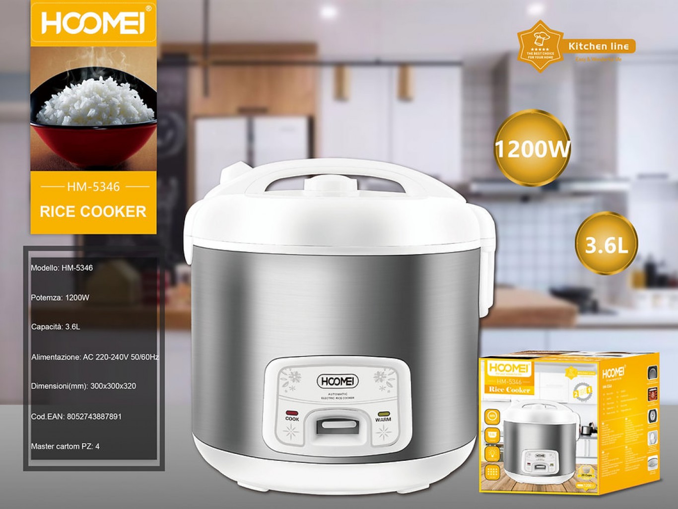 Καινοτόμος βραστήρας ρυζιού 1200W, με την εγγύηση ποιότητας της Hoomei®! Διαθέτει αποσπώμενο εσωτερικό δοχείο 3.6lt από αντικολλητικό αλουμίνιο, εξωτερικό σώμα από ατσάλι και καπάκι με έξοδο ατμού. Είναι εξοπλισμένο με διπλή λειτουργία μαγειρέματος ρυζιού στο σωστό σημείο και διατήρησης ζεστού.