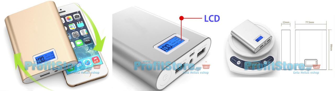 Υψηλής Απόδοσης και Ισχύος Φορητή Μπαταρία Power Bank με φωτιζόμενη ψηφιακή οθόνη LCD. Χρησιμοποιεί υψηλής ποιότητας μπαταρίες με άφθονη ισχύ, μεγάλο κύκλο ζωής και χωρητικότητα 10.400mAh !