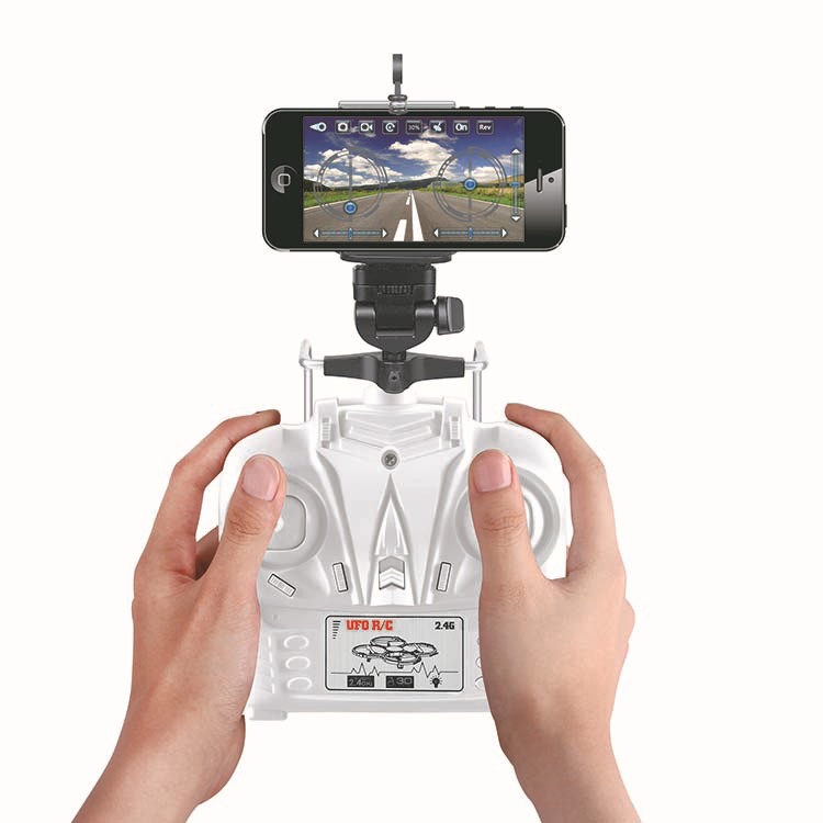 Φυσικά περιλαμβάνεται και πλήρως λειτουργική τηλεκατεύθυνση την οποία μπορείτε να χρησιμοποιήσετε αντί του κινητού σας, η οποία διαθέτει και βάση στήριξης για το κινητό σας, εφόσον θέλετε να βλέπετε σε πραγματικό χρόνο την κάμερα.