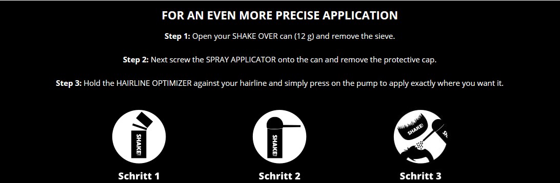 Με το SHAKE OVER Spray Maximizer Applicator έχετε απόλυτο έλεγχο της πυκνότητας στους κροτάφους και στο Hairline, δηλαδή στις πιο σημαντικές περιοχές για την εικόνα σας.
