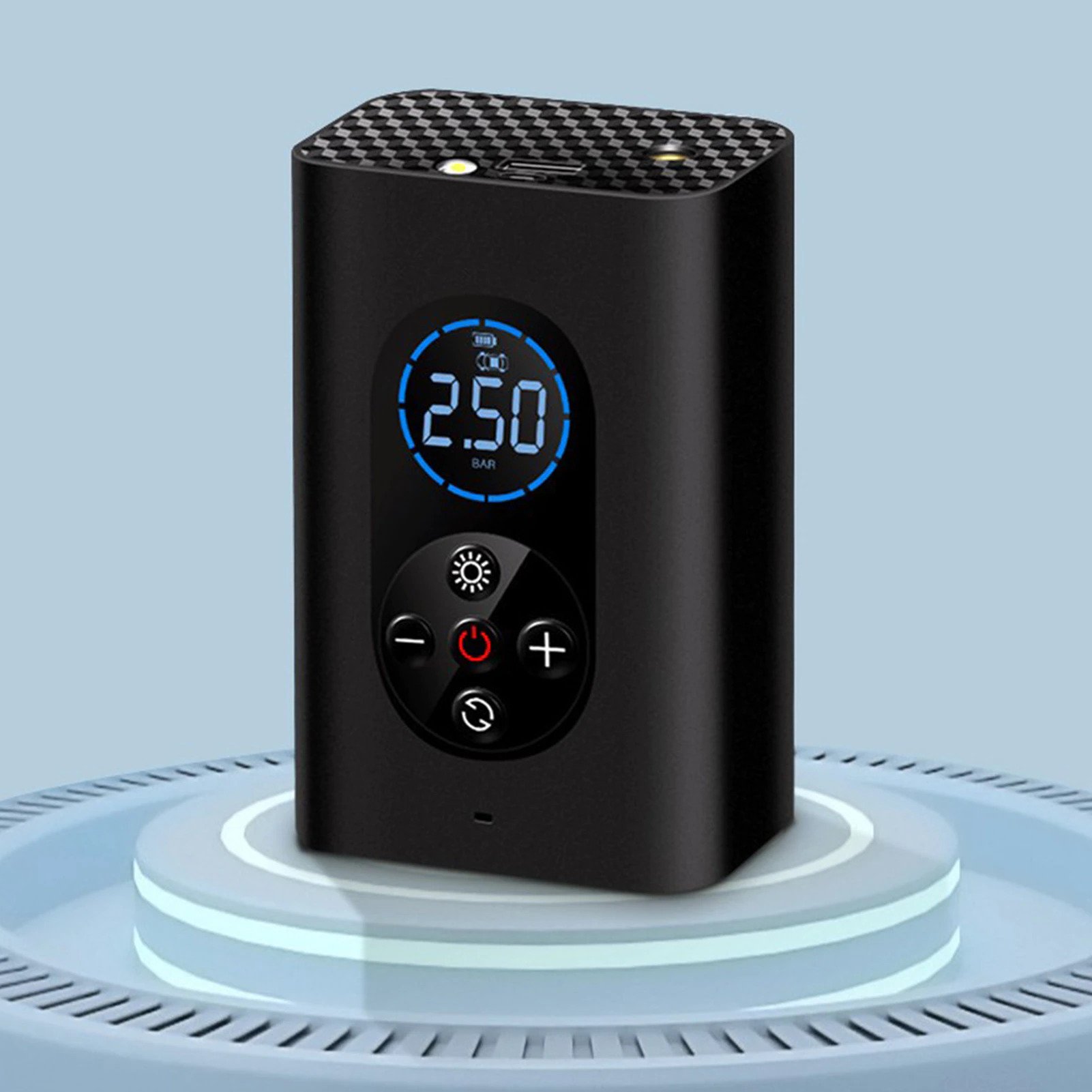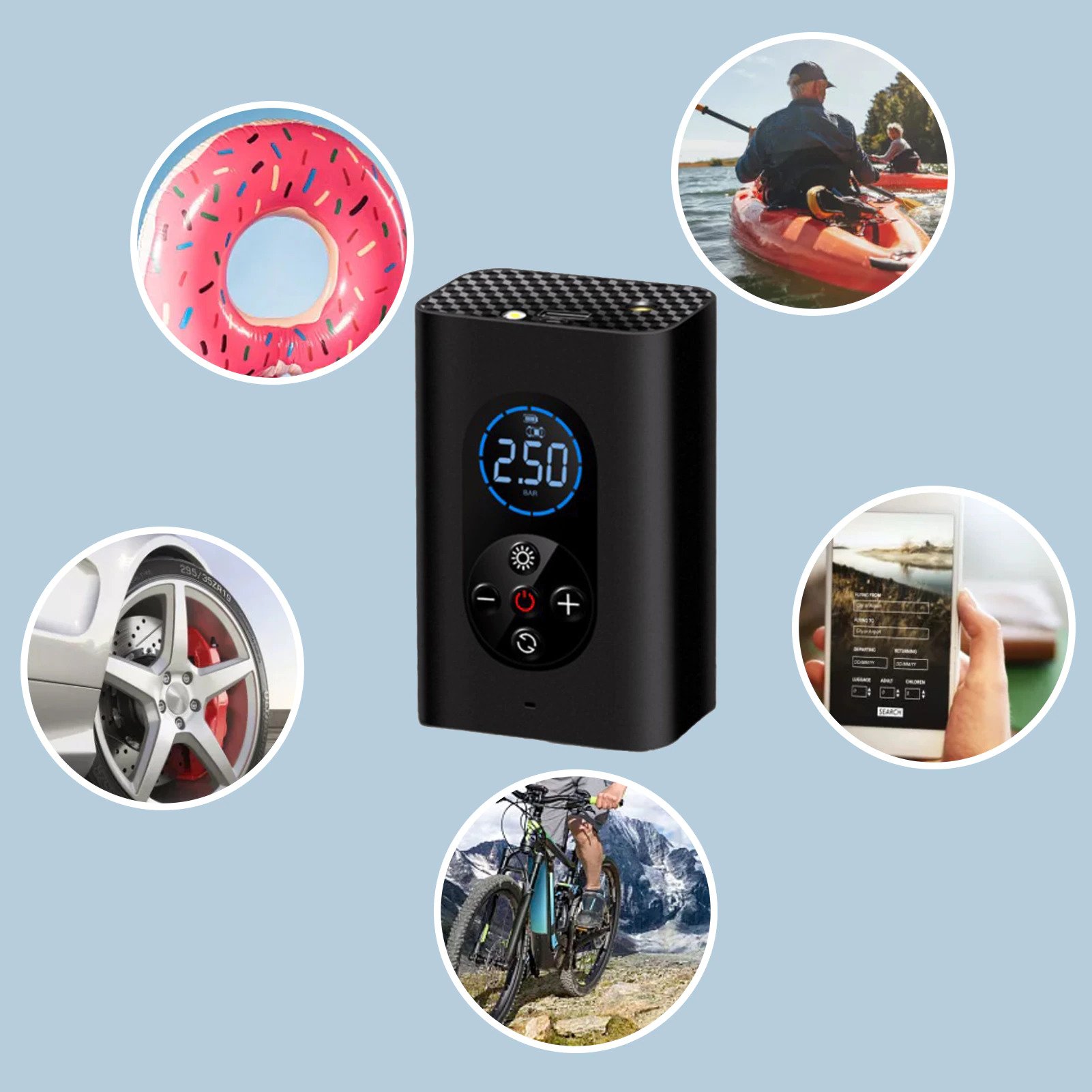 Πρωτοποριακό, φορητό κομπρεσέρ αέρα, έτσι ώστε να μπορείτε ανά πάσα στιγμή να φουσκώσετε τα ελαστικά σας, όπου και αν βρίσκεστε με το πάτημα ενός κουμπιού! Λειτουργεί και ως Power Bank για να μπορείτε να φορτίζετε τις συσκευές αλλά και ως LED φακός. Η μεταφορά του είναι πάρα πολύ εύκολη!