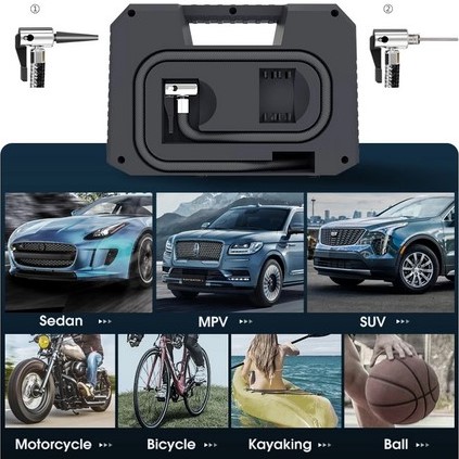 Συνοδεύεται από 3 επιπλέον εξαρτήματα έτσι ώστε να μπορείτε να φουσκώσετε λάστιχα αυτοκίνητου, ποδηλάτου και μηχανής, μπάλες, στρώματα θαλάσσης κ.α