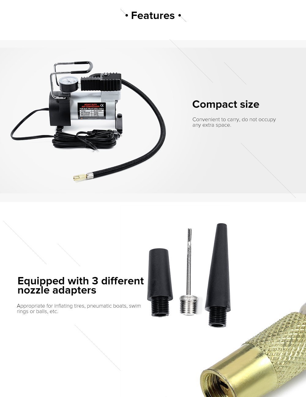 Η συσκευασία περιλαμβάνει διαφορετικά ακροφύσια, με τα οποία μπορείτε να φουσκώσετε σχεδόν τα πάντα.